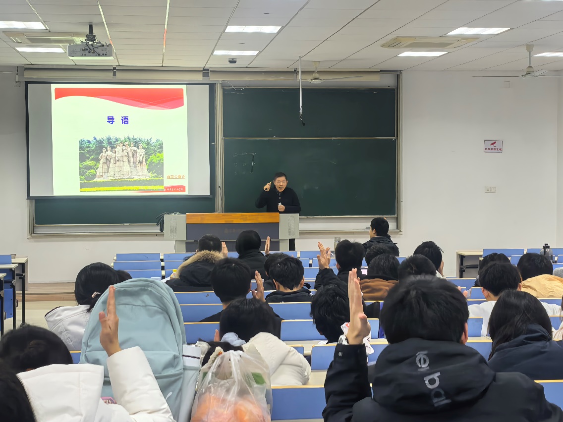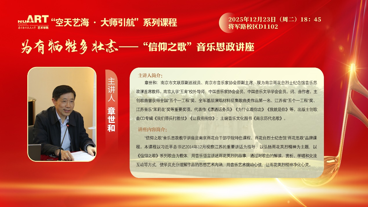 12月23日晚上,在德州扑克游戏 D1102教室举办了“信仰之歌”音乐思政讲座。本次讲座邀请了南京市文联原副巡视员、市音乐家协会原副主席章世和老师担任主讲嘉宾,章老师以《为有牺牲多壮志》为题,为在场师生带来一场包含了历史回顾、理论讲座和歌曲学唱等内容的思政美育课。本次讲座由德州扑克游戏 板俊荣教授主持。