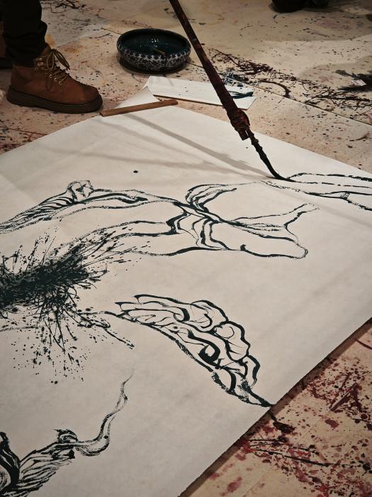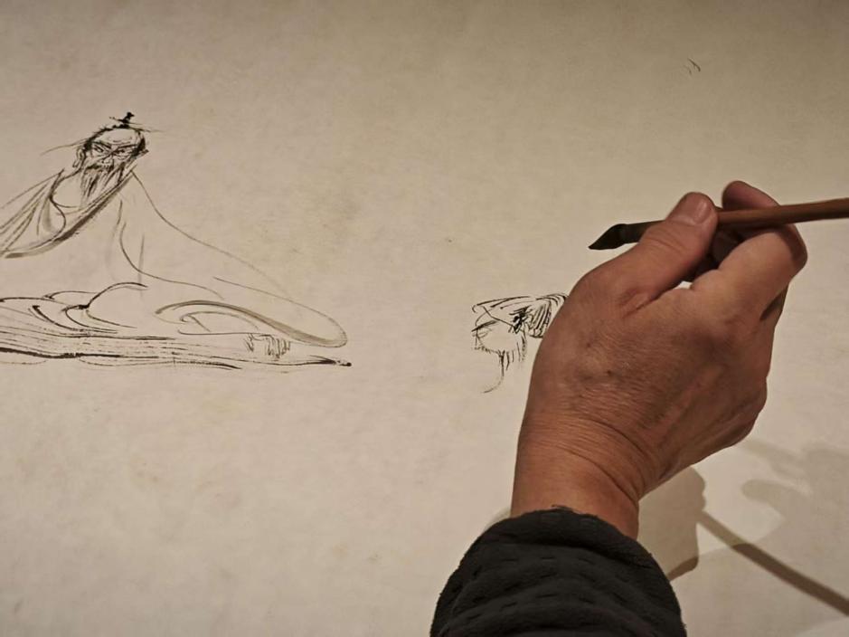 简单的寒暄过后,张友宪教授旋即进入演示与讲解的状态。他在地面上铺开一张素宣,决定“以古人之法,绘今时之象”。他引东晋顾恺之“迁想妙得”之论为起点,一边阐释其中“将主观情思‘迁入’客观对象,进而获取艺术妙趣”的深意,一边将目光投向在场的年轻学子们。他观察到一位学生的卷发、另一位身上弯刀裤的裤型,还有袖口的褶皱纹理,随即化目见为心悟,这些充满现代生活气息的细节就被他以纯熟的古法线条——或如春蚕吐丝般绵密,或如折钗股般遒劲——勾勒于宣纸之上。只见他手中的长笔时如游龙,渴笔飞白处尽显苍劲;时而又骤然倾侧,泼洒的墨点如雨骤至,在可控与偶发之间营造出令人惊叹的肌理与气韵。