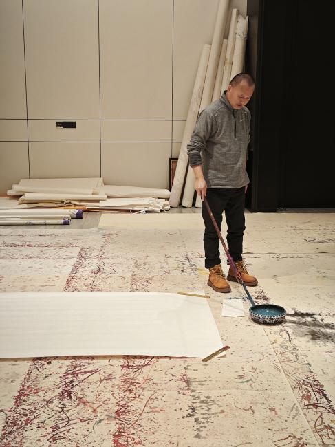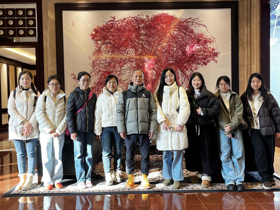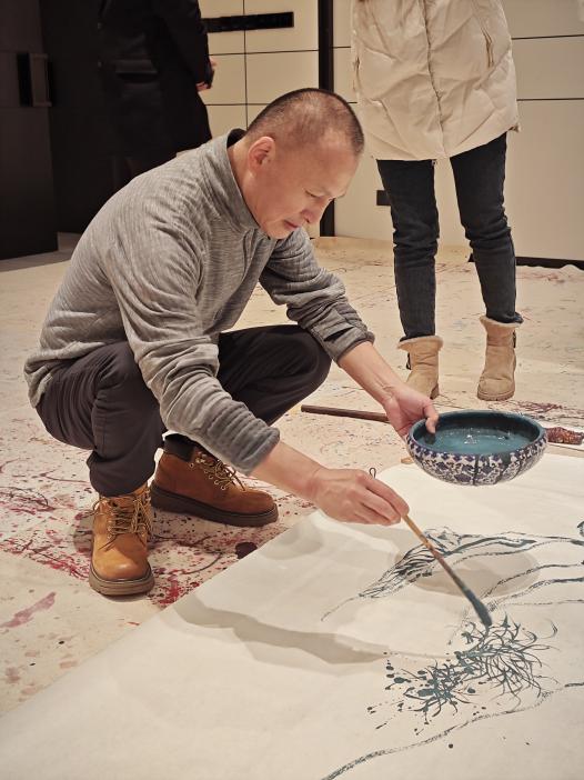 1月27日,德州扑克游戏 王宗英教授带领其门下九位研究生,驱车前往著名画家张友宪教授位于扬州的工作室,开启了一次别开生面的学术实践之旅。此行旨在走出课堂与书本,于笔墨丹青的第一现场,亲身感受中国画传承与创新的鲜活脉动。工作室地面几乎被巨大的毛毡所覆盖,毡上层层叠叠、深浅不一的各色墨迹与颜料,如一部无声的视觉史志记录着无数个创作日夜的激情与沉思。就在这片充满历史感的“地面画布”中央,原南京德州扑克游戏 美术德州扑克游戏 院长、以深厚传统功力和锐意创新精神著称的张友宪教授,正手持一支近一米长的特制笔杆,气定神闲地等待着青年学子的到来。